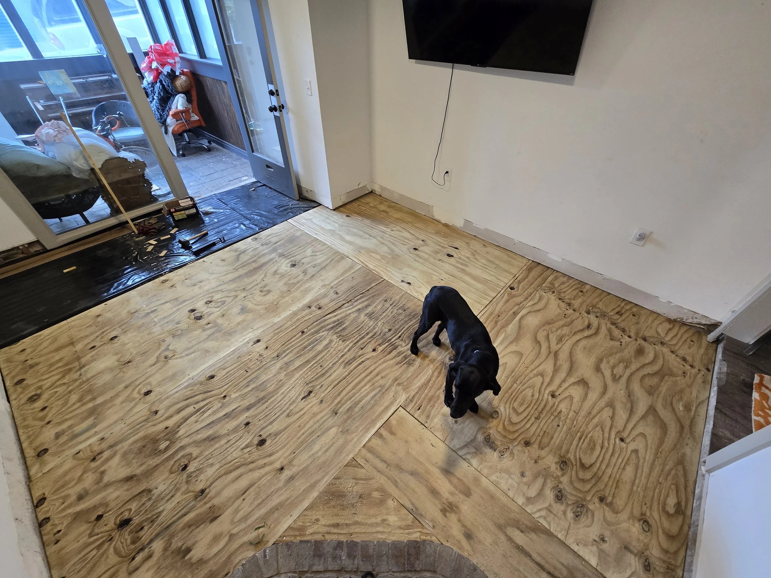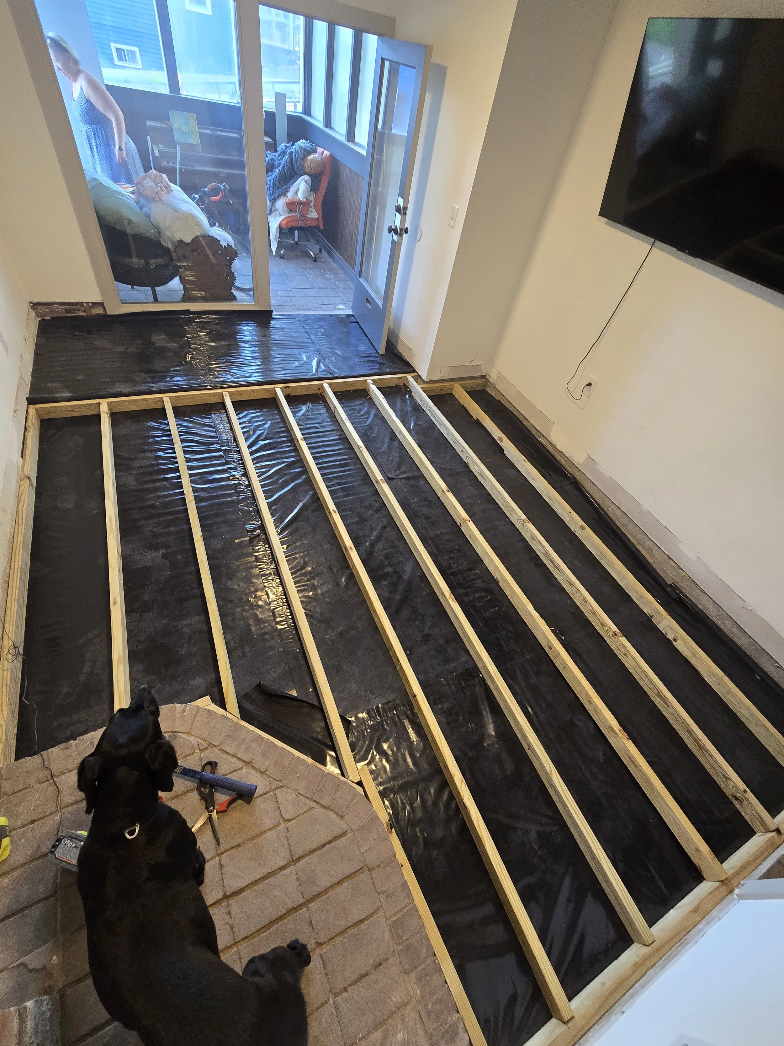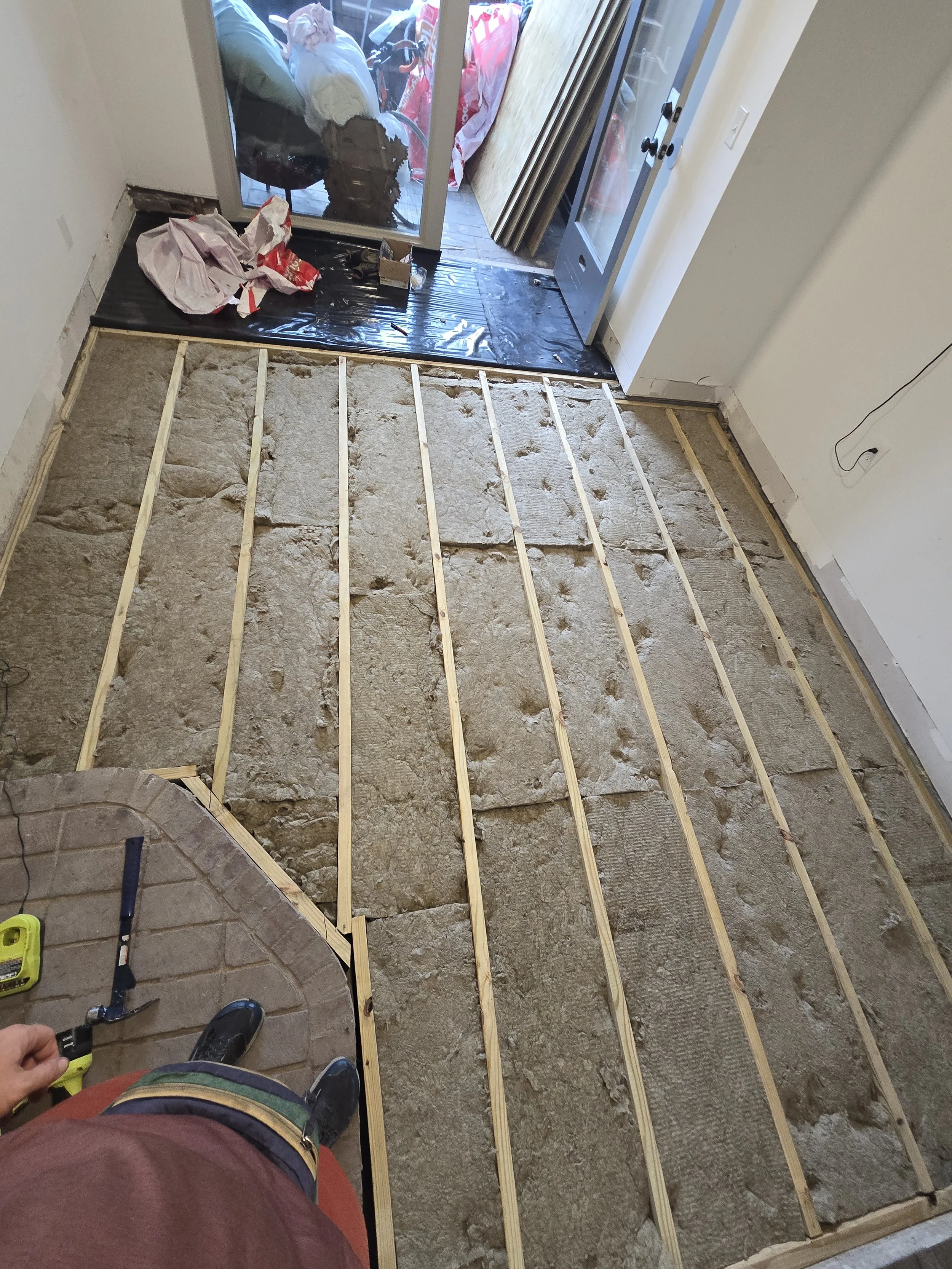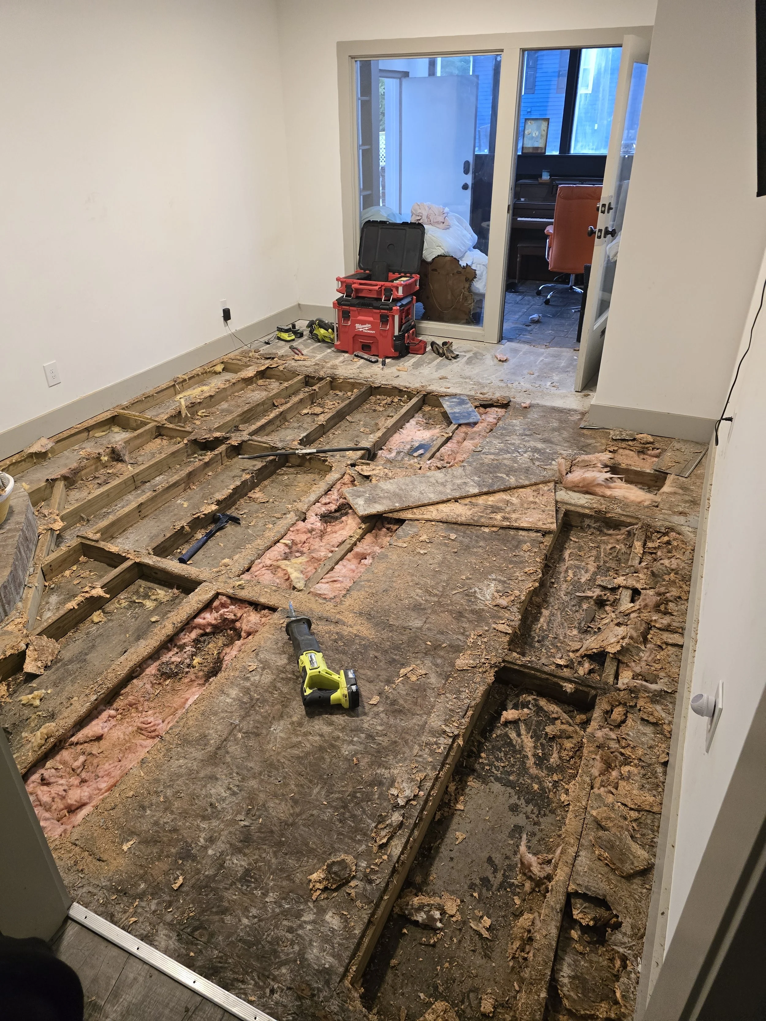 This project was a rotting and sagging floor removal, then laying a vapor barrior on the concrete, building the new supports, insulating, putting down new plywood, and lastly laying the new flooring.
